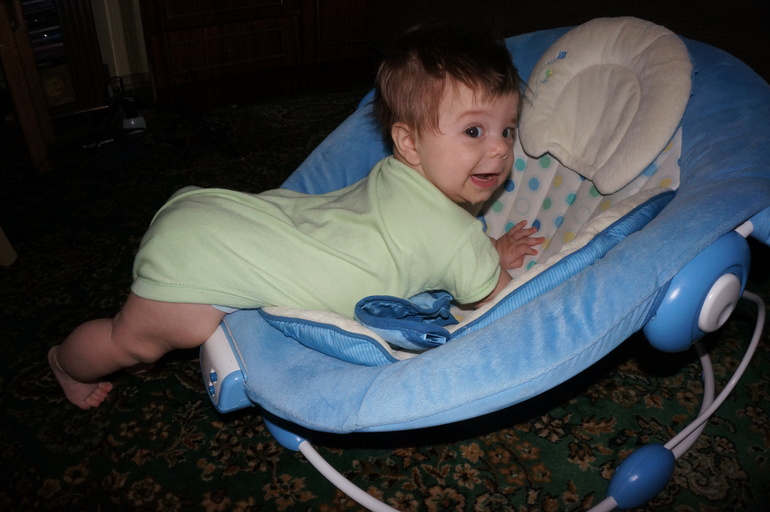 Крутится-вертится во все стороны, в шезлонге не лежит, на коврике неинтересно, в коляске не спит, все свободное время от сна в кровати проводит на ручках, устала.... Ручной стал до безобразия, все кусает, грызет с такой силой, того и гляди без пальца можно остаться... Десна с будущими зубами его очень беспокоят.