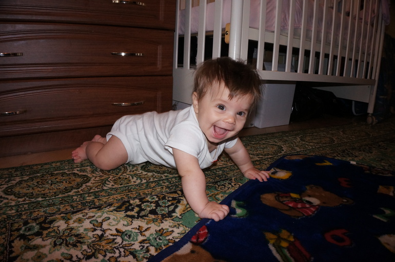 Встал на четвереньки, в позу "попа всему голова" и вообще такие лягушачьи прыжки стал выделывать вперед, а назад на пузе "пропахал" все свободное место на полу в комнате: