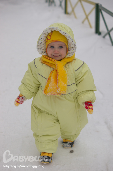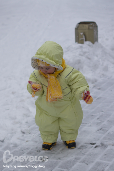 Значит так. На вкус снег Ане не очень понравился. Лазить по сугробам тоже оказалось утомительно. Но все же интересно. Пока в основном присматривалась к этому природному явлению.