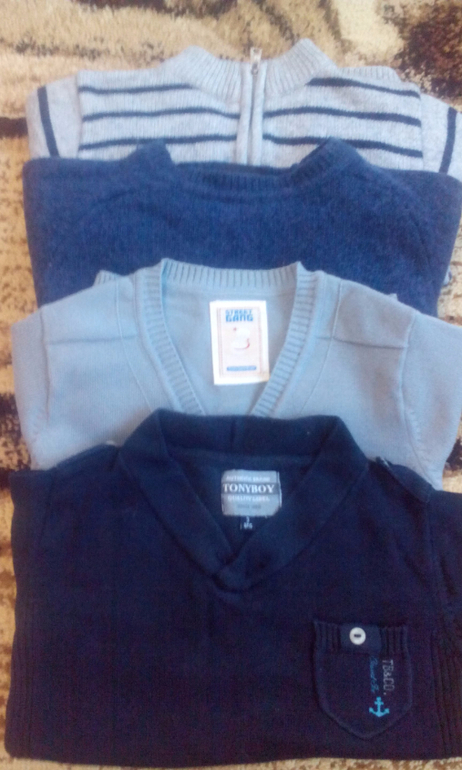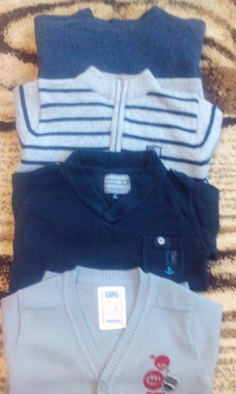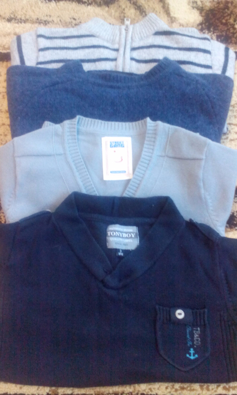 продам свитерочки .б.у в полоску и синий майораль.черный-TONYBOY кофточка на пуговках стрит ганг новая.размеры майораль написано 24 мес.но носили до 3-х лет.черный и кофта на 3 года.состояние отличное цена за 4 шт.2500р