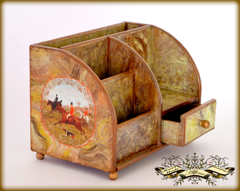 Предмет исполнен в технике декупаж, с использованием приемов имитации слоистых камней (в данном случае ОНИКС), трафаретной и ручной росписи.