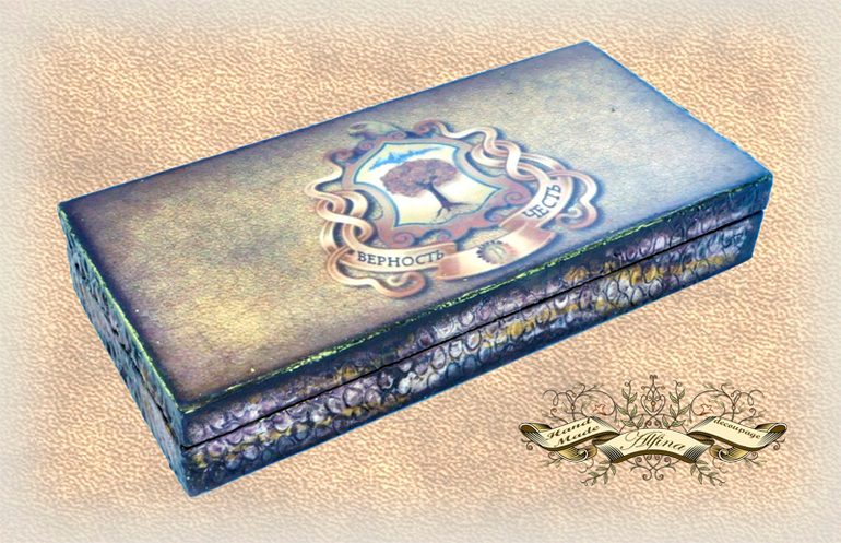 Купюрница изготовлена по индивидуальному заказу. Декор осуществлен в технике декупаж, с применением приемов имитации древесины, имитации змеиной кожи, также с использованием кракелюров. Мотив разработан по индивидуальному заказу в графическом редакторе. Изображение- семейный герб. Внутренняя обивка - искусственная замша, декоративные шнуры.