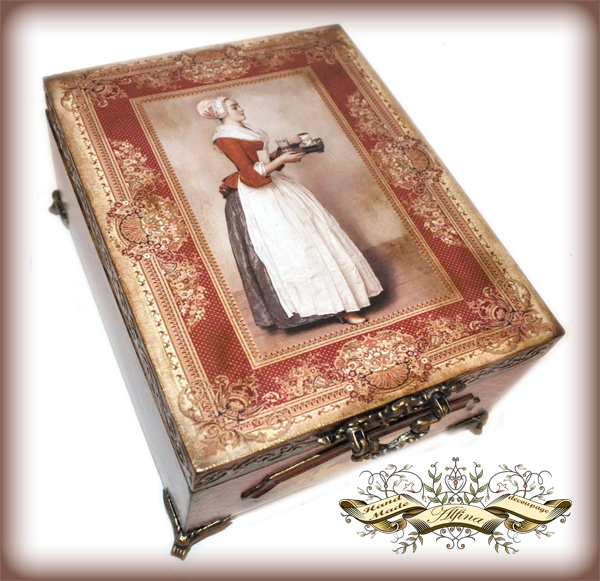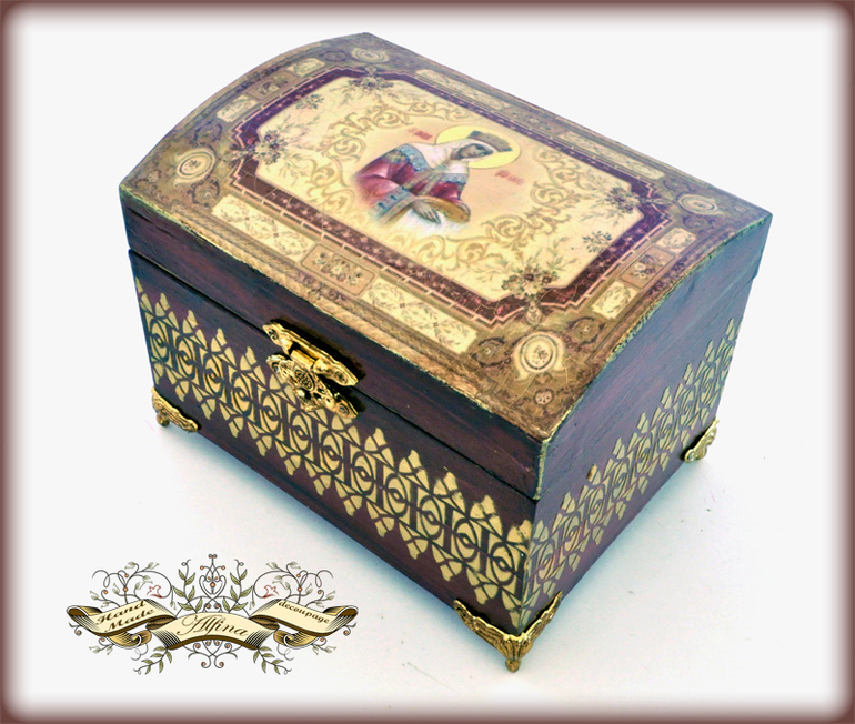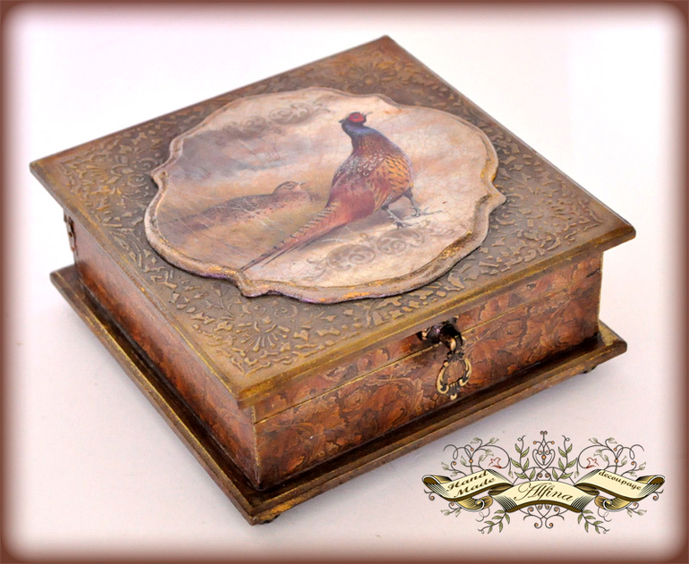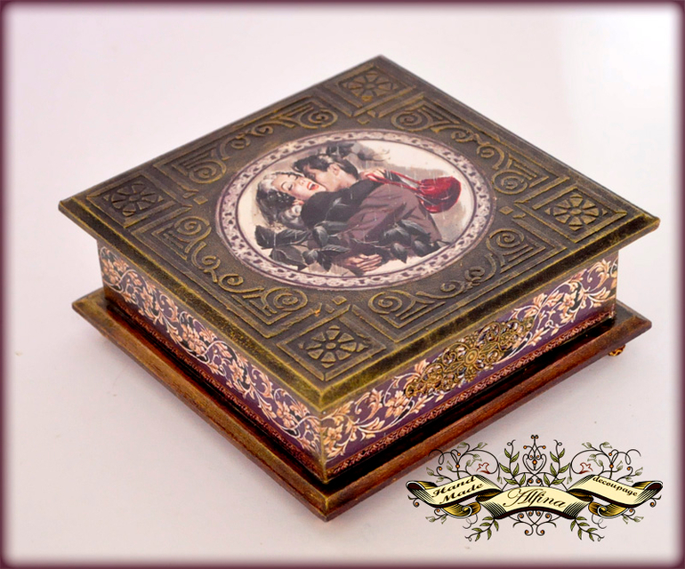 Предмет исполнен в технике декупаж, с применением объемной трафаретной росписи. Внутри - обивка бархат. Применена интересная фурнитура. Золочение, патинирование, кракелюр.