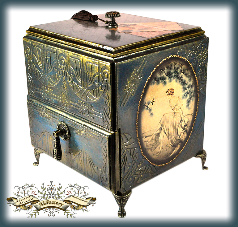 Специально для творческой студии Марии Захаровой "Территория творчества" г. Омск, мной отснят интереснейший мастер-класс по декорированию данного комодика. Итак, встречайте: Комод настольный для бижутерии, для маникюрных принадлежностей и прочих дамских штучек: "Девушки Икара". По мотивам картин Луи Икара.