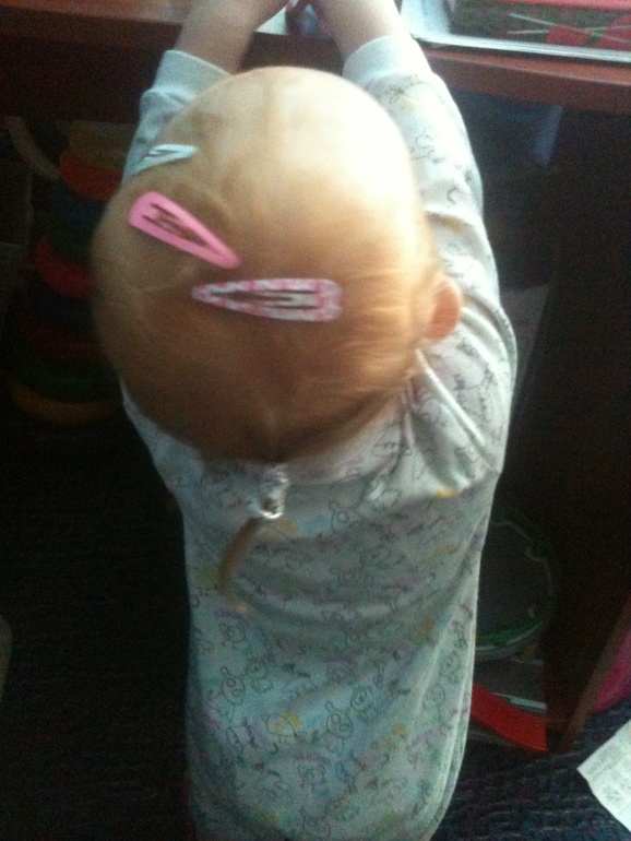 Юная леди, насмотревшись на старшую сестру, тоже хочет прическу с заколочками и резиночками. а волос-то мало. Но мы не сдаемся) и...