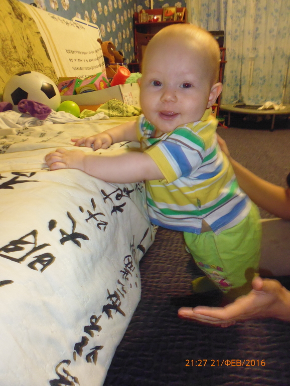 С 9,5 может вставать и без опоры, но ленится. Ходить не жаждит, любит ползать. Сторшие любили в этом возрасте, чтоб их за ручки водили, Ольга не любит. Хочет сама, но ползком.