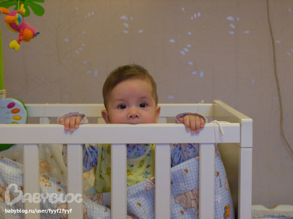 Ползает быстро. Выдирает штепсели из розеток, облизывает их! Сует пальчики в розетку. Рвет обои. Обсасывает свои носки так, что можно их выжимать. Обожжает игрушку-чебурашку и когда видит его на другом конце комнаты, так радостно ахает и мчится к нему, что аж падает с дивана:( Встает на ноги в кроватке, падает моськой в перила:(( Плачет. Сама стоит на коленях. Начала бросать предметы: игрушки, ложки. Тырит предметы со стола,что возле дивана. Рвет и жует книжки...Сегодня первый раз сама целовала маму, то есть меня))) Хотя нет, самый первый поцелуй достался всеже чебурашке)))))