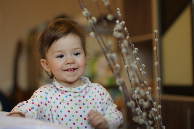 Потом мы быстренько собрались и отправились в церковь, чтобы причастить именинницу. Конечно, прекрасно,что праздник наш совпал с вербным воскресением, но вот народу было в церкви- просто не войти! Почти все пришли святить вербу. Мы пытались продираться сквозь жаждущих освященной вербы, но это казалось тщетным-Дашка от ужаса начинала плакать. Муж предложил вернуться домой, но мне было обидно так вот уйти не солоно хлебавши в Дашкин праздник. И все-таки когда начали причащать, я продралась сквозь тернии верб к Чаше и причастила доченьку, хоть и не все прошло гладко.