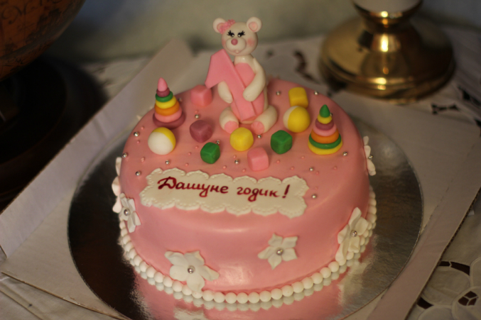 Затем отдохнув и забрав праздничный торт, мы отправились к деду- то есть моему папе. Там Дашку завалили подарками- преподнесли две юлы, конструктор лего Дупло (Дашка в востороге), а мастерица-Лена связала для прекрасной именинницы новую шапочку и хлопковый комплект- сарафанчик с накидкой. А мы вручили ей говорящий плакатик с веселыми животными-музыкантами. Дашку в веселеньком розовом платьице мы все без конца фотографировали и снимали на видео. Отчего скоро подустали и сели за стол отмечать. Все было очень вкусно, а праздничный торт- просто великолепен. А Дашке я сварганила специальный детский тортик- творожное тирамису, так что получилось всем вкусно и весело. И , как это пишется обычно в школьных диктантах, усталые, но счастливые мы позлно вернулись домой:)