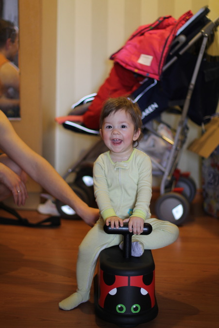 Утром в день рождения нас прежде всего пришли поздравить Дашины крестные с нашим крестничком Колей (извиняюсь за каламбур:) и подарили замечательное средство передвижения- "Букашку". Дашундер теперь очень важно катается на этом девайсе по коридору, заруливает на кухню. Я даже как-то прокатила ее по длинному общему коридору, что возле лифта, было весело)