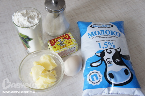 Сколько продуктов у меня ушло: 2 стакана молока + 3 ст.ложки, 2 стакана муки, 2 яйца, 3 ст.л. сахара, 0,5 ч.л. соли, 10 гр. преосванных дрожжей, 80 гр. топленого сливочного масла (настоящее деревенское) и подсолнечное масло для жарки