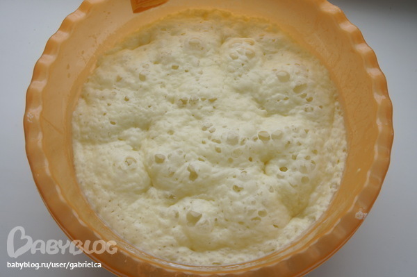 В другой миске взбиваем 2 желтка с 0,5 ч.л. соли и 1 ст. сахара. Потом добавляем топленое сливочное масло ( растопленное ) взбиваем. Теперь добавляем 1 стакан муки и еще 1 стакан теплого молока. Накрываем полотенцем и оставляем в теплом месте минут на 40.