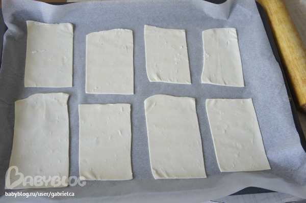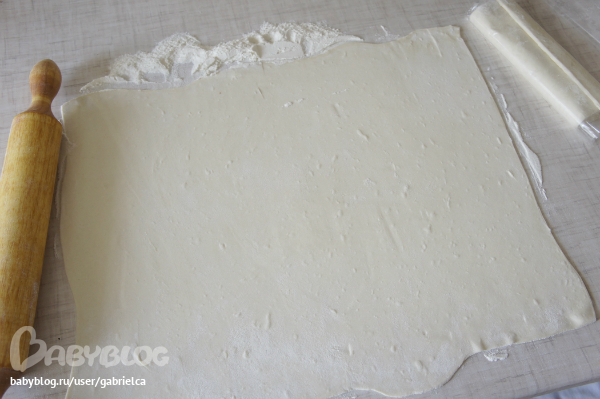 Все делается очень просто - берем слоеное бездрожжевое тесто и раскатываем тонко