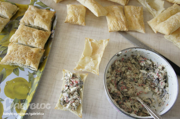 Начинка у меня была салатная . Вот тут есть подробно как делать салат http://www.babyblog.ru/community/post/cookingbook/936337 с жаренными крабовыми палочками. Только тут я все перемешала. В каждую половинку кладем салат и накрываем второй половинкой. Даем постоять на одной боку с часок, потом переворачиваем на другой бочок. Чтобы тесто было не сильно ломким и пропиталось салатом.