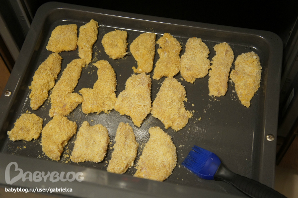 Противень смазываю маслом и выкладываю на него наггется. запекаю в разошретой духовке минут 25 при 180-200 гр.