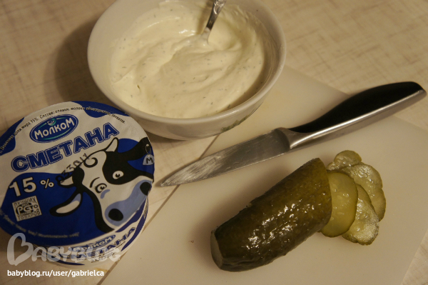 Пока наггется готовятся, делаю соус. Сметану смешиваю со столовой ложкой горчицы, кладу немного зелени укропа, пару капель сока лимона, солю. Потом нарезаю очень мелко соленный огурец и добавляю в соус. перемешиваю