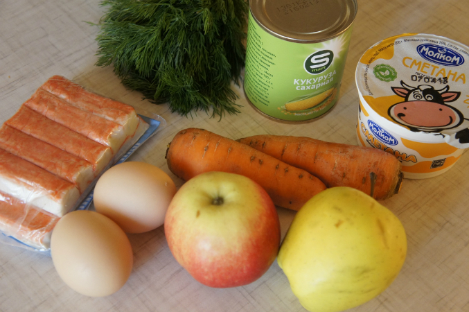 нам нужны : свежая морковь, яблоки, вареные яйца, крабовые палочки, кукуруза, зелень, сметана или майонез.