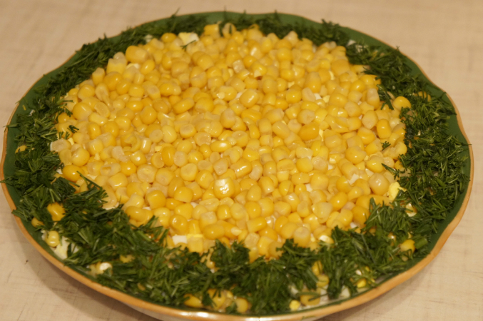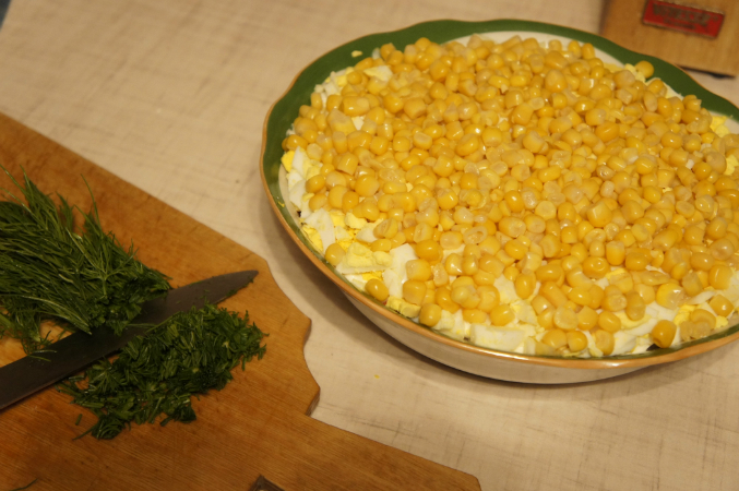 теперь очередь варенных яиц, только мелко режим, солим и сверху укладываем кукурузу.