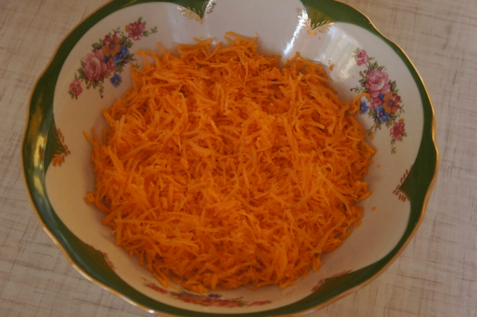 Морковь трем на мелкой терке и укладываем на дно салатника, слегка смазываем сметаной или майонезом