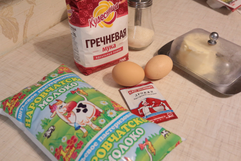 делаем опару. Берем стакан теплого молока и растворяем в нем чайную ложку дрожжей, добавляем стакан гречневой муки, сахар и соль. И оставляем минут на 40 в теплом месте.
