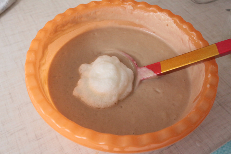 взбиваем желтки со сливочным маслом гр. 70 и отдельно белки. В опару добавляем еще стакан теплого молока и полстакана гречневой муки ( всего молока примерно 0.5 л. и муки 250-300 гр. )