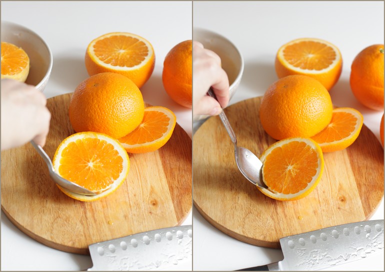 сначала с помощью ложки немного отделить мякоть от кожуры - по кругу