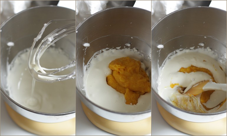 Желтки взбить с половиной сахара, до бела, выложить апельсиновую массу и аккуратно вымешать