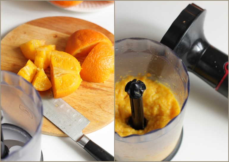 Апельсин хорошо вымыть в горячей воде, варить в кастрюльке полтора часа, остудить, разрезать, вынуть косточки, и пюрировать(вместе со шкуркой - её не убираем!)