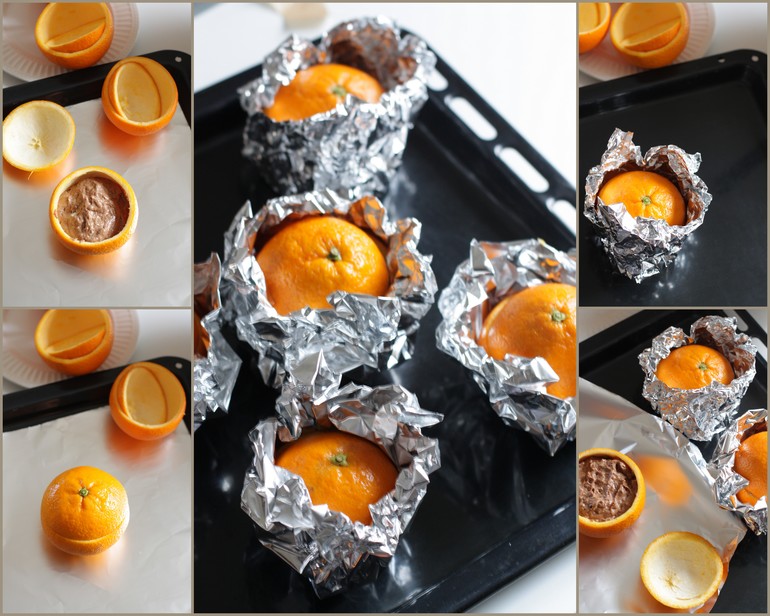 Форму-апельсинку прикрыла крышечкой и завернула в фольгу, можно сильнее завернуть, так крышка зафиксируется и не съедет, когда тесто поднимется.