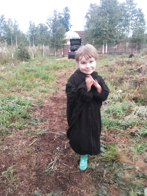 Тем временем серьезно похолодало. А я, поросенок эдакий, почему-то решила, что некие теплые вещи на даче есть и ничего теплого с собой не взяла Лизочке. Пришлось обходиться подручными средствами кофтами...