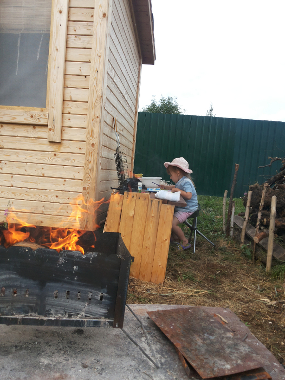 Естессно, во время покраски напрочь перепачкались краской и стали как после ветрянки, отмывание бензином сделало ситуацию, конечно, получше - но о возвращении домой на электричке(как ранее планировалось, чтоб мы с Лизочкой на электричке, чтоб не поздно вернуться домой, а Костик под ночь - на машине) в эдаком пахучем состоянии, конечно, речи уже не шло))) Поэтому стали дожидаться вечера.