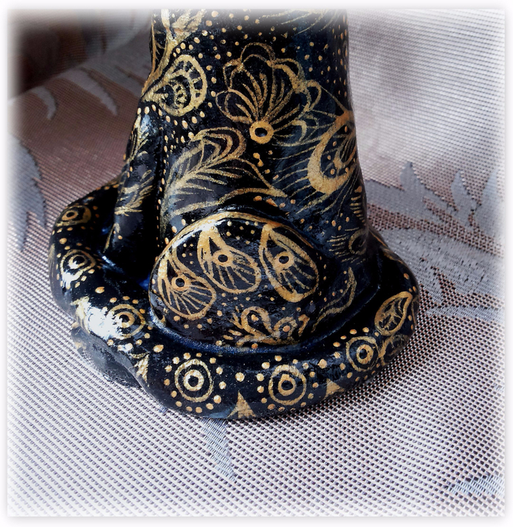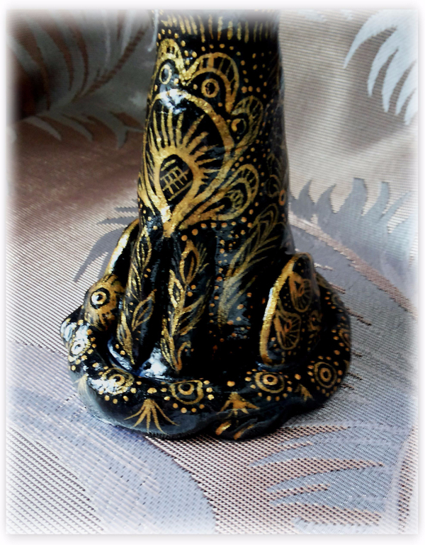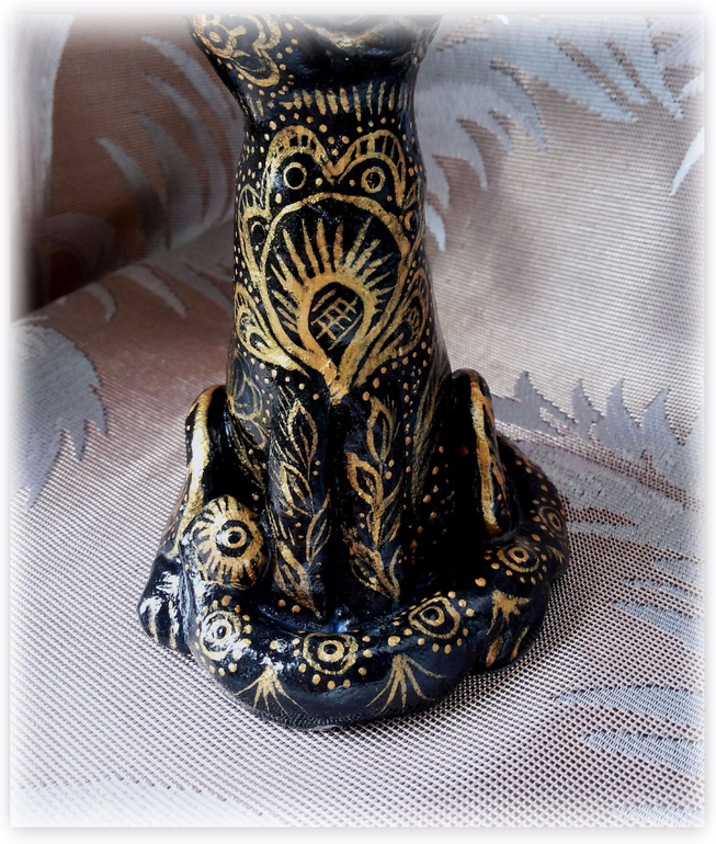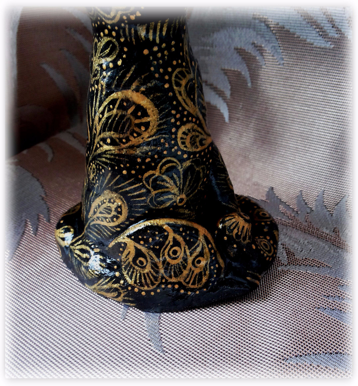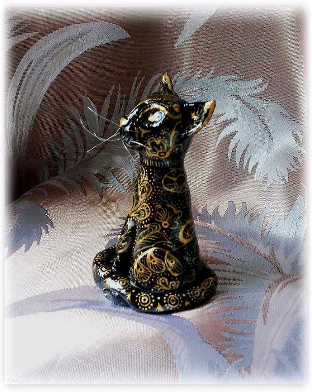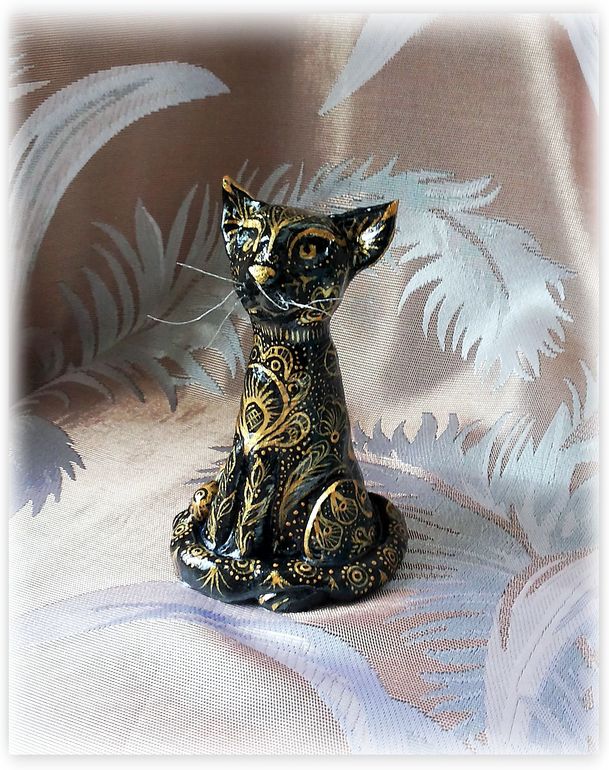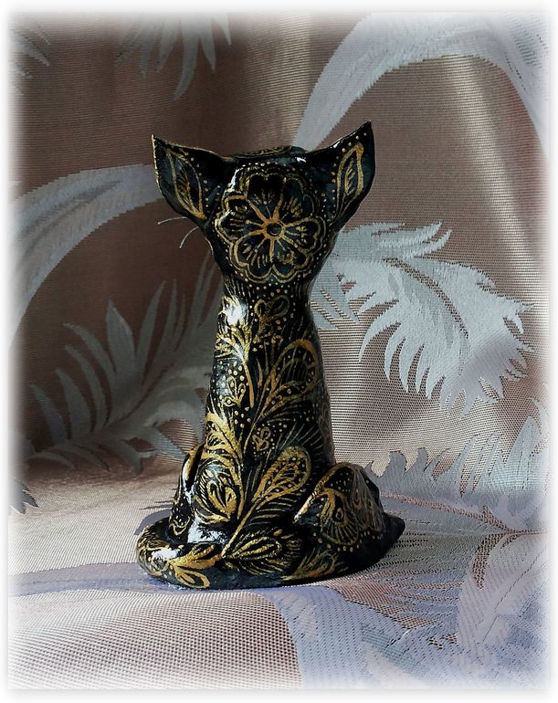 Давно неравнодушна я к индийским вещицам. А от индийских ваз, которые золотая резьба по черному - так просто в восторге. Когда-то я даже вазу деревянную так расписывала, в подарок, давно это было. "А почему бы не вспомнить былое, и не расписать в этом стиле... ну, скажем... кота?" - задалась я как-то вопросом. Сказано - сделано, слепила из соленого теста кота и... ну, о том, что получилось - судить вам. Фоток много: он весь бликует и сфоткать достойно никак не получалось...