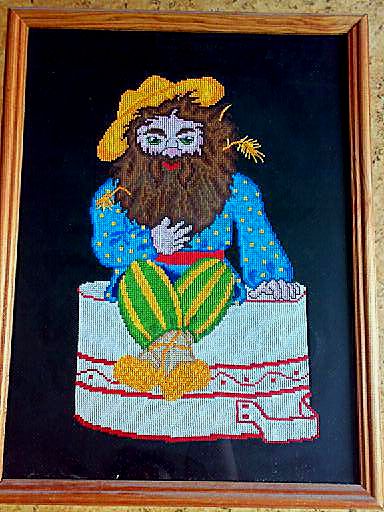Ну, следующим номером - Домовой. Схему рисовала сама, вышивала, соответственно, тоже лет.... ой, это же с ума сойти... лет эдак 23-25 назад, еще в школе, потом - подарила однокласснице. Не маленький Домовой-то получился, см 38 в высоту будет... А недавно(с этой подругой мы по сей день общаемся) вспомнила про него и попросила прислать фото, и вот, показываю)))