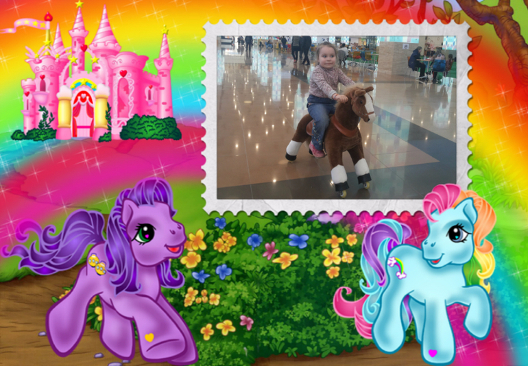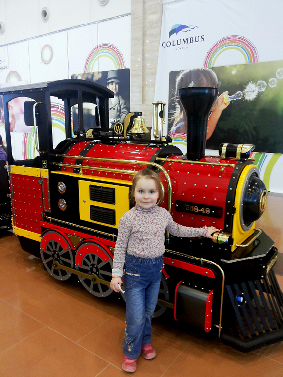 ... и такие "авто" - лошадка. В отличие от "пандомобиля", он не аккумуляторная, а механическая, передвигается при нажатии на педали, как будто скачет))) Лиза довольна страшно!