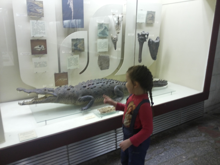 Чучело крокодила. Лизочка испугалась и подходила к витрине с опаской:"Мам, он точно не живой?"