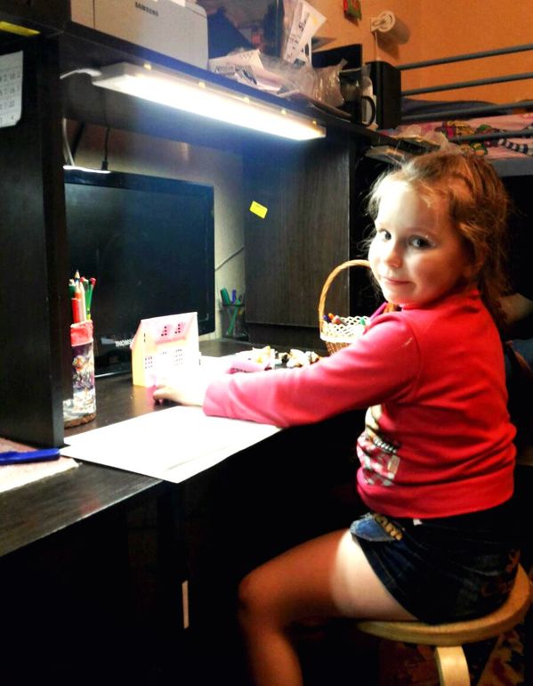 Вот так)) А по приезде домой Лизу ждал сюрприз: Костик с Петей собрали для нее Свой Личный Настоящий Взрослый Стол! Лиза довольна, как слон! Вот она: