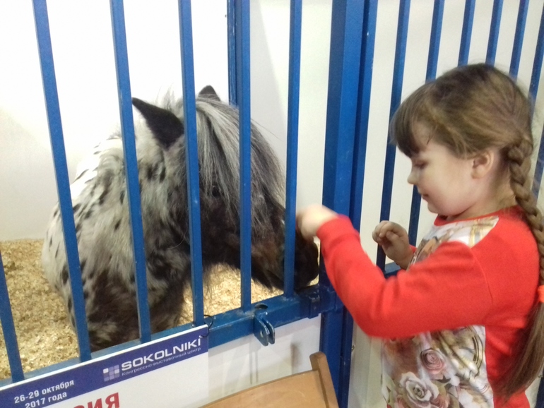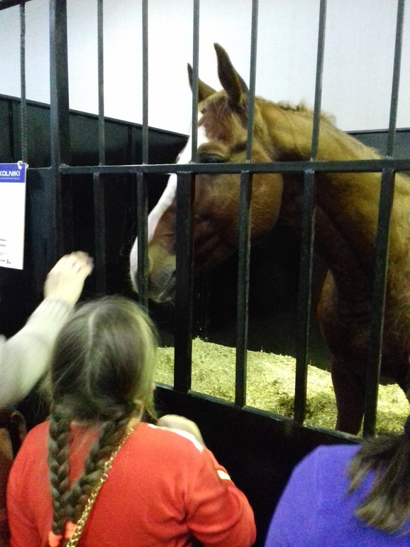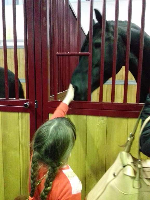 А еще там есть выставочные денники, там стоят прекрасные лошади от огромных фризов до мини-лошадок. Всех, за редким исключением, можно гладить и кормить(только корм нужно купить там же), а к некоторым можно и зайти.
