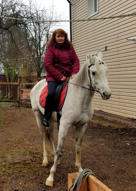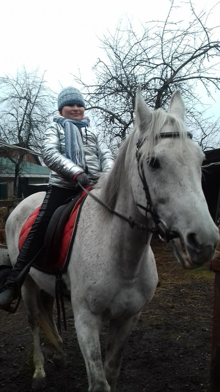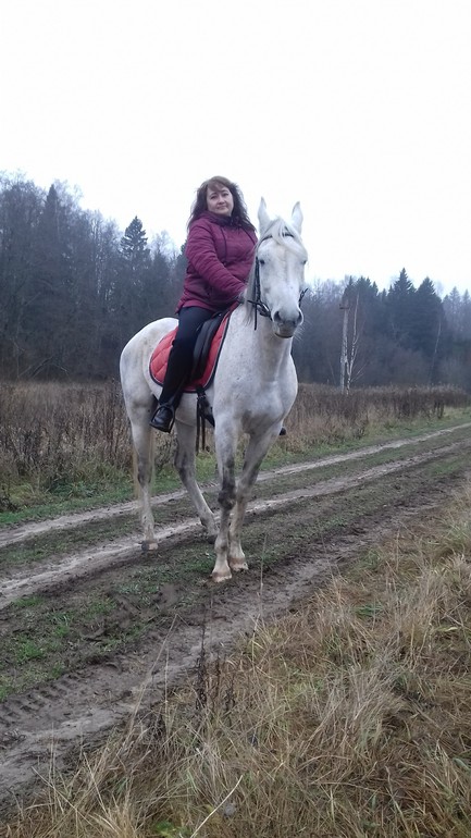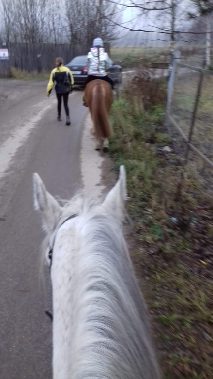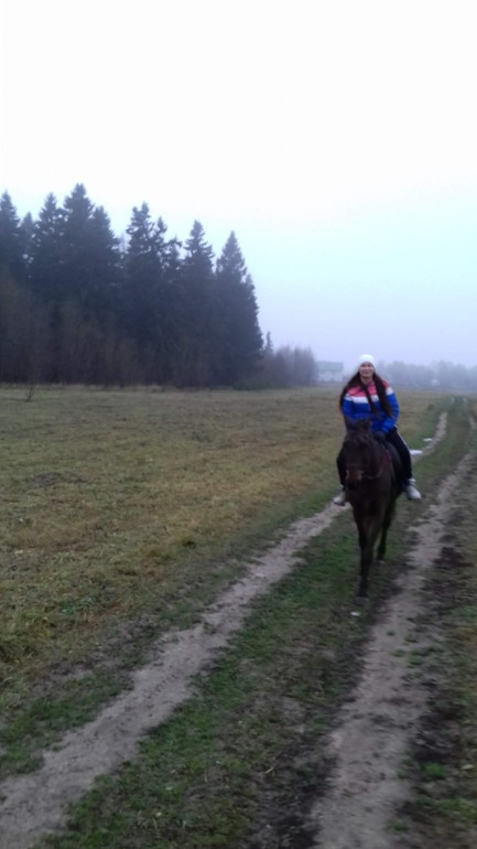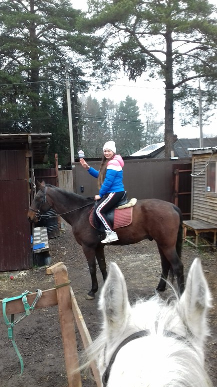 Ню-ню. Опускаю стремя. Нога начинает дотягиваться. Отлично! Уверенной рукой цепляюсь за седло, подтягиваюсь, и... повисаю ненадолго в воздухе. Блин, ну как так-то?! Я же очень сильная, я на даче столько всего переношу в руках! Пытаюсь еще и еще - безрезультатно. Блин, чего делать? Приходит на помощь Катя - с помощью ее подпихиваний моей задницы, я, наконец-то, преодолеваю земное притяжение и оказываюсь на коне, подтягиваю стремя. Урааа!!!