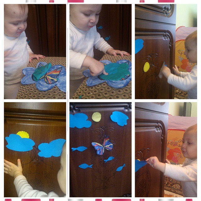 2игровой день) #цветик_шестицветик. Цвет синий)все таки солнышко очень весело искать!вместо птички у нас была бабочка,полетали с ней по всей комнате,пританцовывая)потом спрятались под тестом,мелкая быстро сообразила где искать и через минуту тесто мы уже жевали,речка у нас была из маминого платочка!хотела на голову одеть!рыбки приклеила двусторонним скотчем к шкафу,приклеивать и срывать оттуда ей было намного интереснее и удобнее!лото нас не заинтересовало,но старшая поиграла с радостью!день проходит на позитиве!!!