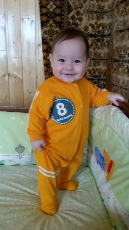 Уверенно садится с четверенек, встает у опоры и пытается опускать одну руку, начал ползать! Проползет вперед чуточку, садится, отдохнет и снова ползет... Охотится теперь за тапками и подбирает крошки на полу...Мама, убирайся тщательней! у Даньки уже 4 зуба😊.