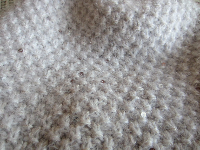 Ношу уже месяца два, но руки дошли только сейчас) Пряжа - нитка Гэлекси бело-бежевая, две нитки итальянского супер кидмохера белого цвета и ниточка бобинного мериносика цвета пудры. Фото, к сожалению, не передало ни реальный цвет, ни мерцание пайеток, ни нежный шапочкин пушок...