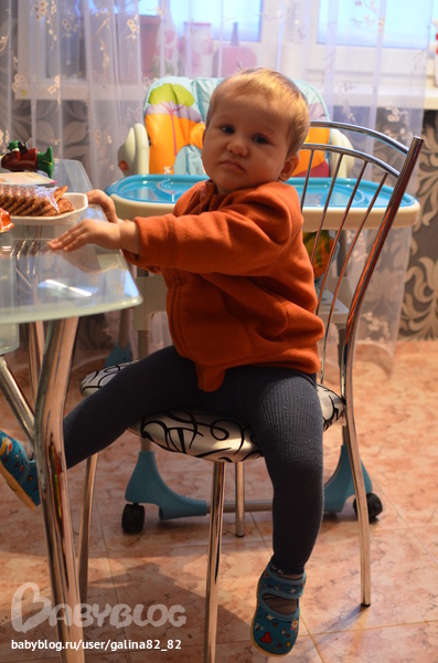 В последнее время Дима полюбил сидеть на взрослых стульях, но стулья у нас только на кухне. Но как он на него взбирается....у меня сердце выпрыгивает из груди от страха. Стул на мой взгляд не очень устойчивый, да и плитка кафельная на полу, падать больно. Зато зам процесс Диме доставляет удовольствие, сидит как взрослый)))