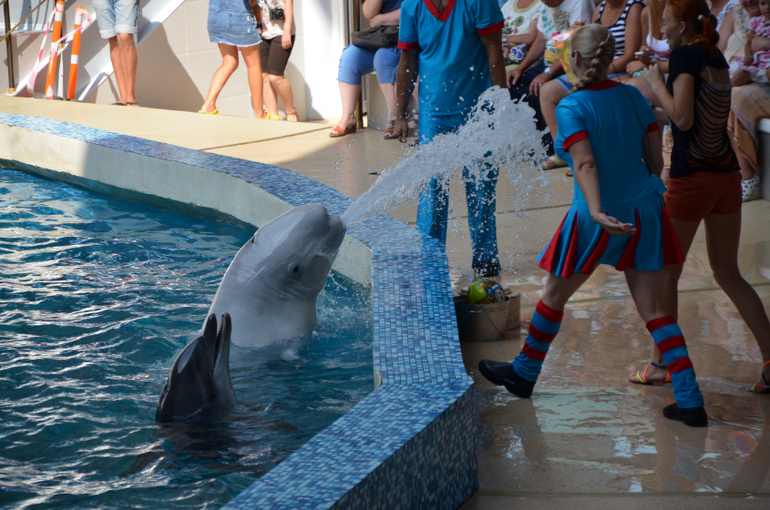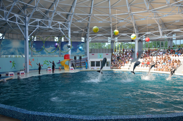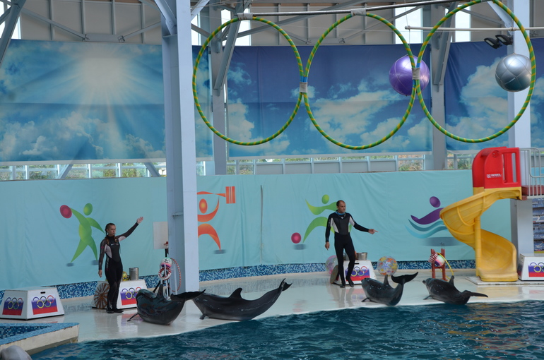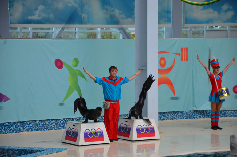 Еще были в евпаторийском дельфинарии. Билет на взрослого 500руб, Дима опять бесплатно. С 2012 года переместился в абсолютно новое современное здание с открытым куполом. Программа весьма интересная, но как мне показалось очень затянута вначале. А поскольку мой трехлетка не отличается усидчивостью, то пока они дошли до самого интересного Диме изрядно все надоело. Да и вообще его больше привлекала девочка на верхнем сидении года на 1,5 младше его. Вот ее то он и сверлил глазами все представление. В программе участвовали морские котики, морские львы, два белых кита и четверо дельфинов.