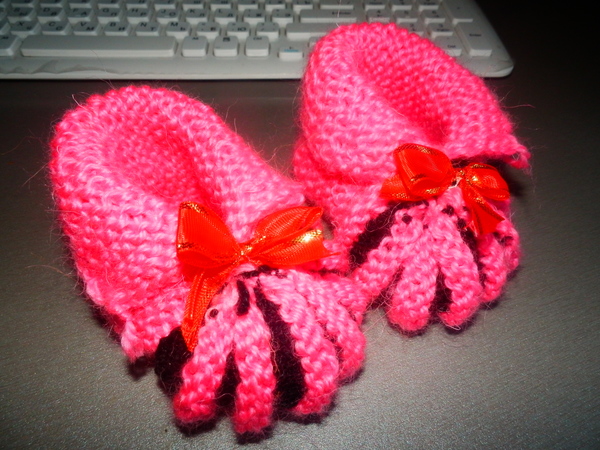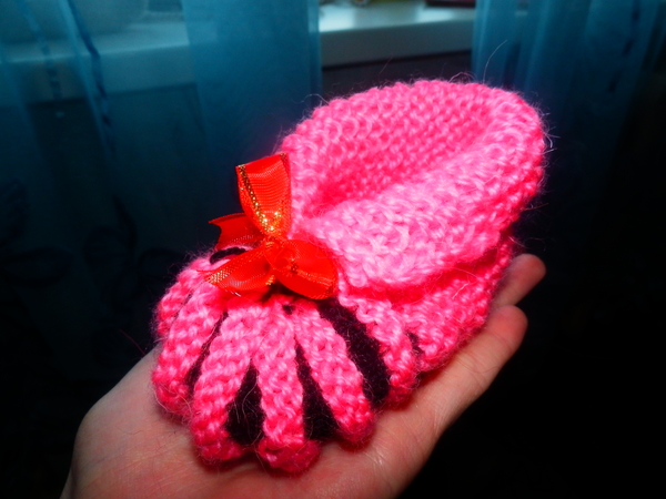 Терпения у меня не хватает,да и вязать то особо не умею.Авот вчера что-то нашло на меня,давно хотела пинеточки для доченьки связать сама,и вот что вышло: