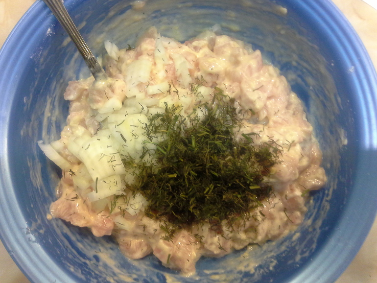 Разбиваем 1 яйцо, кладем немного муки, примерно 3 ст.ложки майонеза, солим, перчим, мелко нарезаем лук репчатый, зелень (я добавила сушеный укроп).