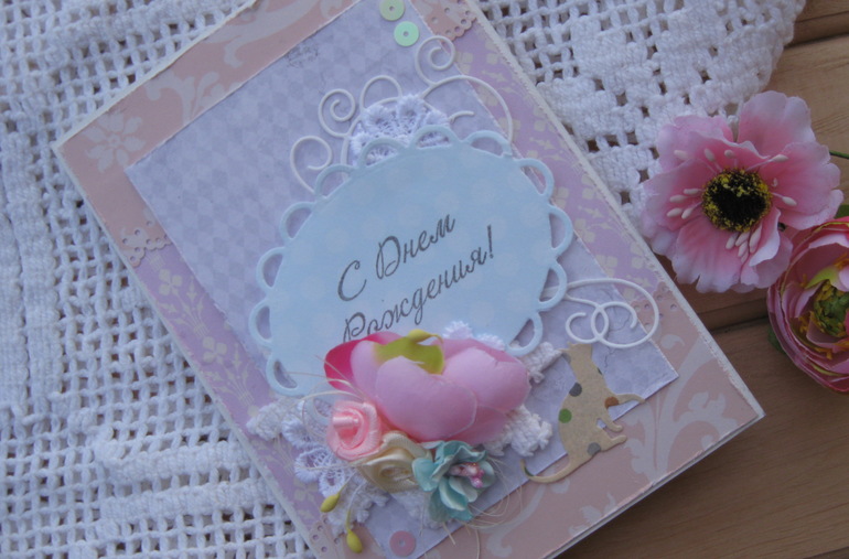 К основному подарку мы с дочкой решили сделать ей открыточку. Моя дочурка помогала во всю: мазала клеем, наносила чернила на штампики, придерживала. И вот, что у нас в итоге получилось.