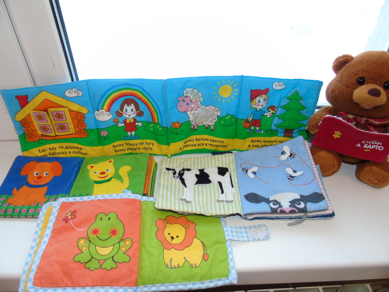 Наши первые тактильные книжечки-игрушки. Рассматривали, мусолили, шуршали и засыпали под стихи А.Барто с музыкальным мишкой)))