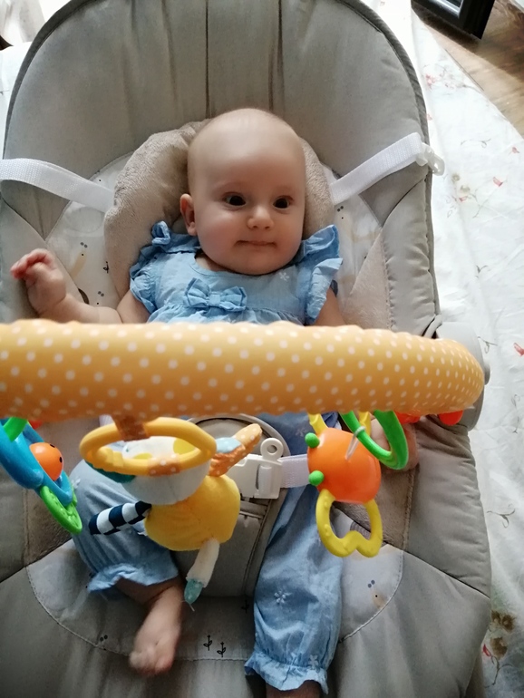 Самый цимис это ставить качель в нашу малогабаритную кухню и пытаться что-то успеть, пока она там играет и, вроде как, видит меня постоянно. Там она лежит 10-15 минут, ещё минут 5 я могу её убалтывать, делая какие-то дела. Потом всё. Только ручки. Иду в кровать, кладу её на колени и развлекаю погремухами, пока не настанет время следующего сна/кормления.