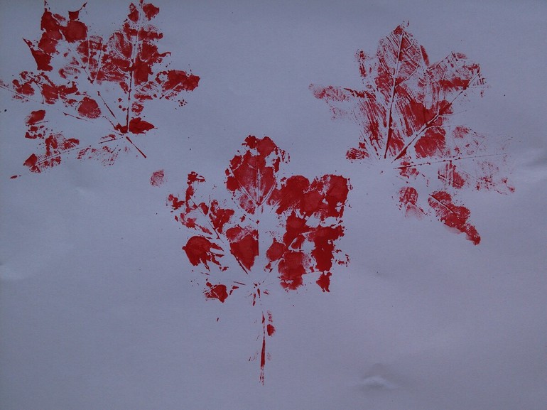Потом разукрасили листья и сделали отпечатки. Надя увлеклась красной гуашью)