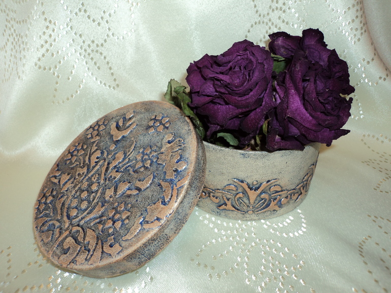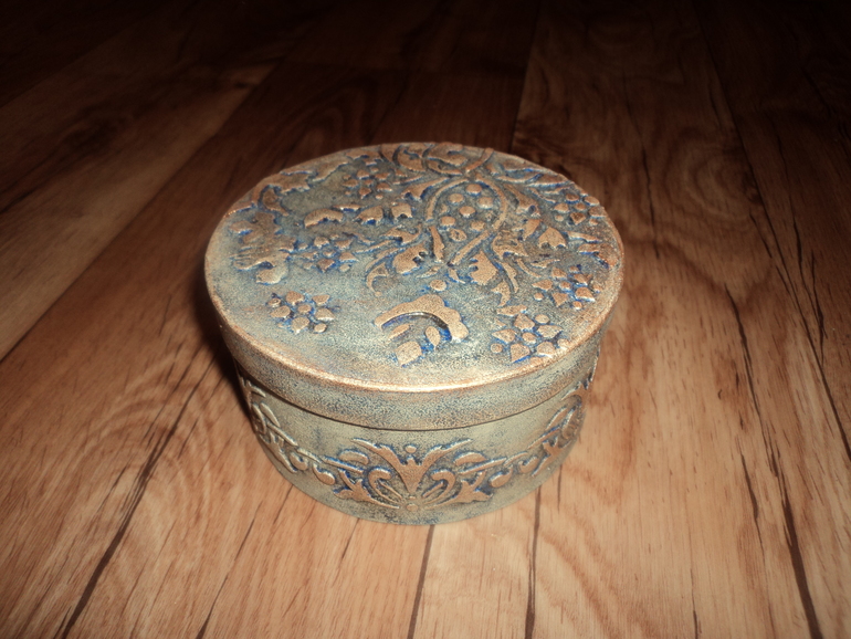 Долго они у меня лежали и вот дошли до одной руки. Решила заодно испытать новую для меня технику сложного окрашивания. и вот она -круглая шкатулочка.
